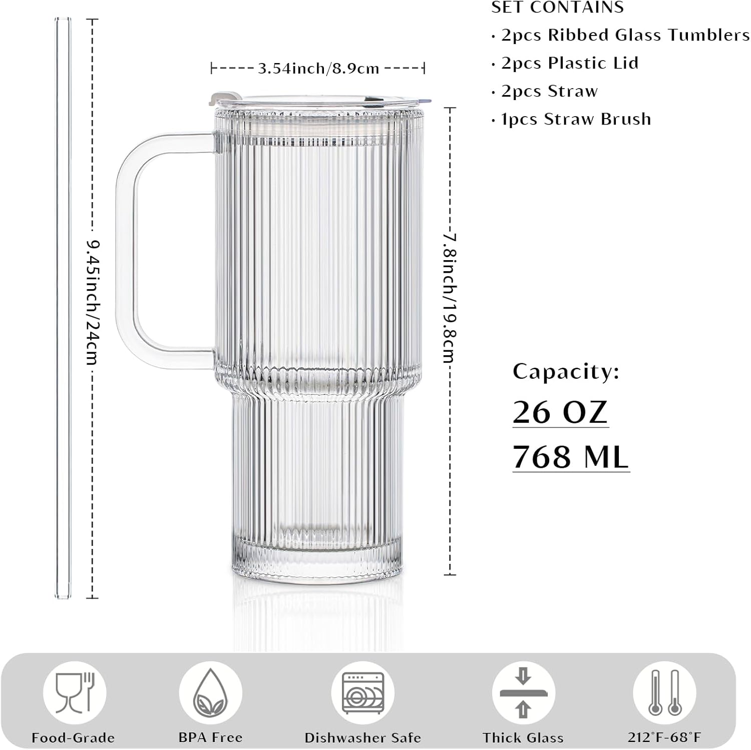 INSETLAN 26oz Ribbed Glass Tumbler with Handle & Lid – 2-Pack Large Iced Coffee Cups with Straws, Modern Glass Mug for Cold & Hot Beverages, Aesthetic Travel Cup for Smoothies, Tea, and Juice