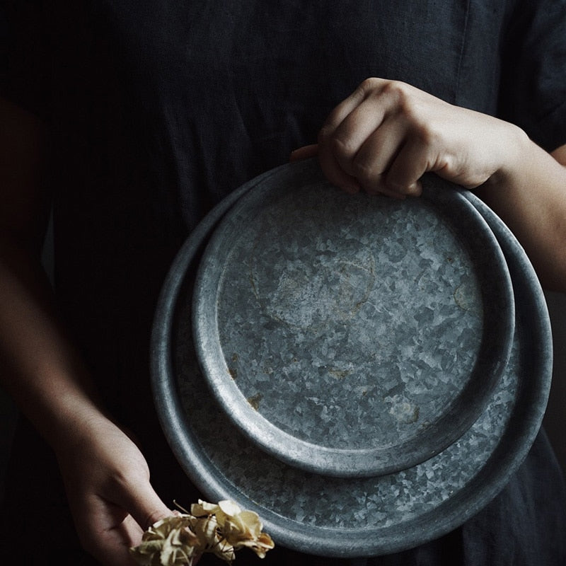 Iron Craft Storage Serving Tray, Antique Metal Round Tray