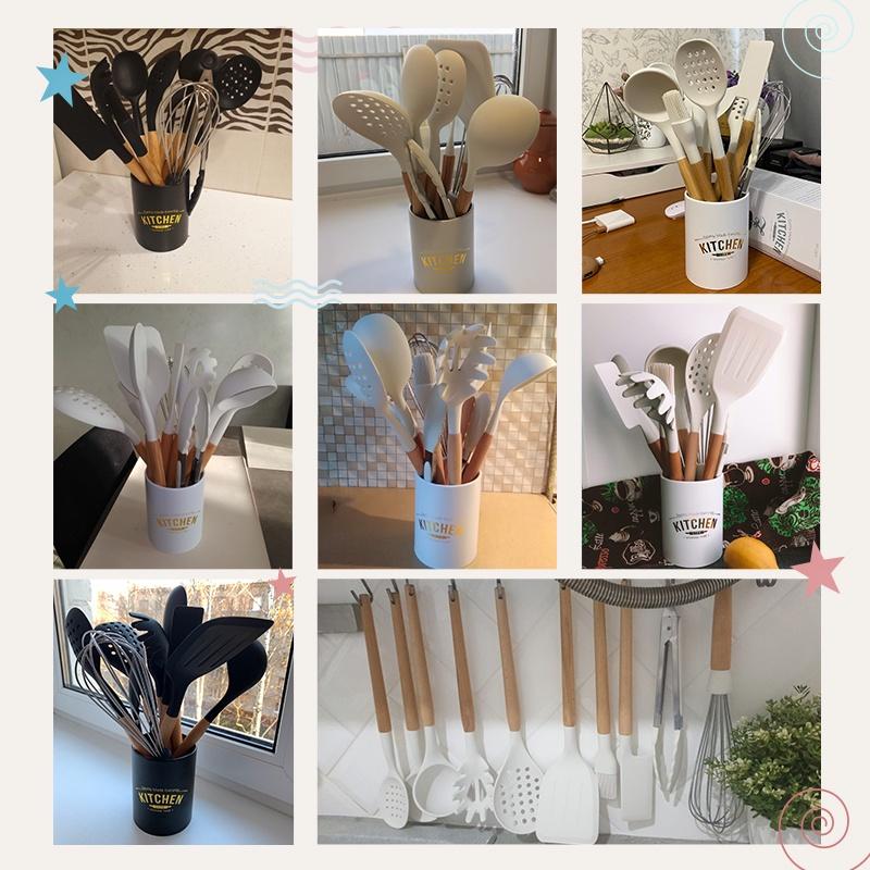 - 【FULLY MEET THE NEEDS OF THE KITCHEN. NO MORE WASTE OF MONEY】 These kitchen utensil sets include 9 cooking tools and 4 baking tools. A large utensil holder. Buy it at one time and get what you need in the kitchen. No more waste of money. Deep Soup Ladle, Solid Serving Spoon, Slotted Spoon, Flexible Spatula, Round Spatula, Pasta Server, Slotted Turner, etc. These silicone kitchen utensil perfectly protect the surface of the non-stick pan from scratches.